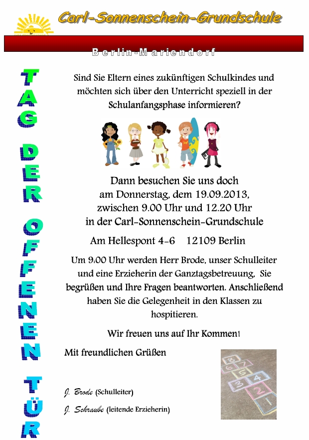 Um 9:00 Uhr werden Herr Brode, unser Schulleiter und eine Erzieherin der Ganztagsbetreuung Sie begrüßen und Ihre Fragen beantworten. Anschließend haben Sie die Gelegenheit in den Klassen zu hospitieren.