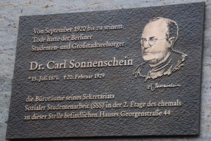 Nach einer kurzen Rast auf dem Spielplatz fuhren wir weiter zur Gedenktafel von Herrn Sonnenschein. In der Georgenstraße 44 war sein Büro, an das diese Gedenktafel erinnert.