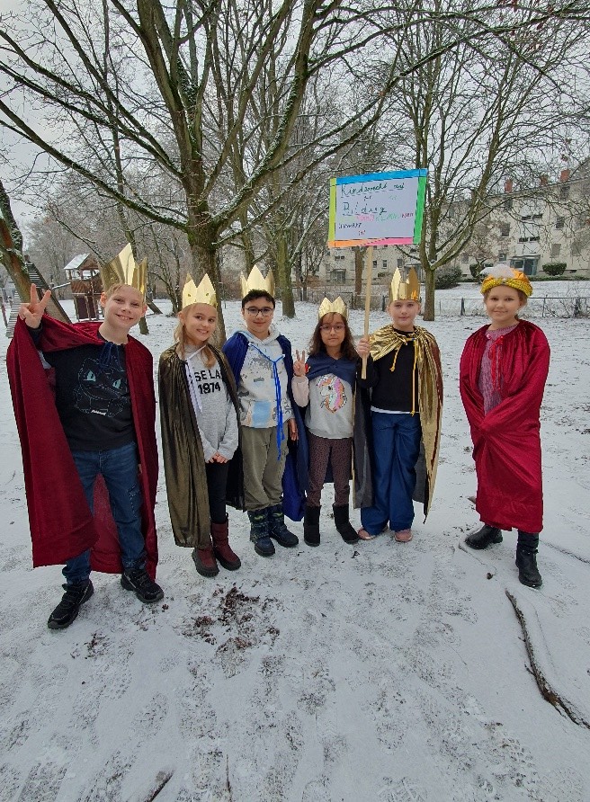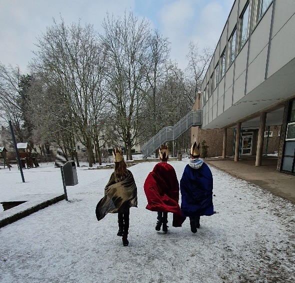 Vor den Winterferien bereitete sich die Religionsgruppe der 4a und 4b als Sternsinger mit Liedern und Segenstexten vor, um dann am 27. Februar 2026 mit Gesang und Segensgrüßen der Schülerschaft ein gutes, erfolgreiches Jahr 2026 zu wünschen.