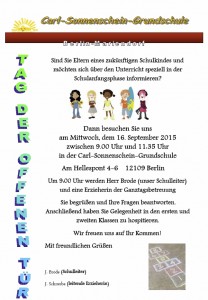 Sind Sie Eltern eines zukünftigen Schulkindes und möchten sich über den Unterricht speziell in der Schulanfangsphase informieren? Dann besuchen Sie uns am Dienstag, dem 15.09.2015 zwischen 9:00 Uhr und 11:35 Uhr in der Carl-Sonnenschein-Grundschule Am Hellespont 4-6 12109 Berlin Um 9:00 Uhr werden Herr Brode, unser Schulleiter und eine Erzieherin der Ganztagsbetreuung Sie begrüßen und … Tag der offenen Tür weiterlesen